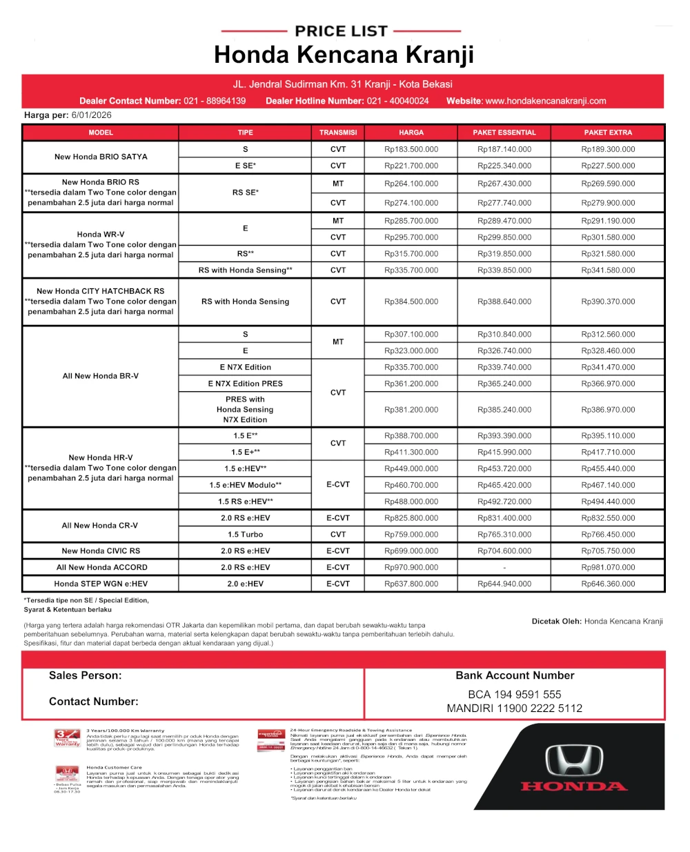 Berikut ini daftar harga mobil Honda di Dealer Honda Kencana Kranji, Bekasi